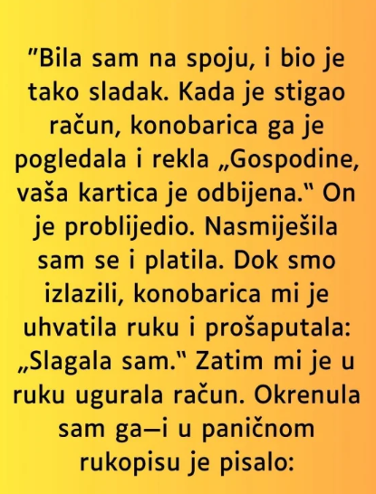 Dok smo izlazili iz restorana, desilo se nešto neočekivano. Konobarica me tiho povukla za ruku. Nagnula se i gotovo nečujno rekla: „Slagala sam.“ U ruku mi je gurnula račun.