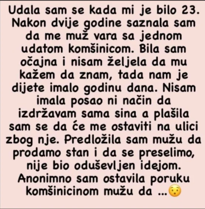 Samo dvije godine kasnije, saznala sam da me suprug vara. I to ne s nekom nepoznatom osobom – već sa udatom komšinicom. Bio je to trenutak koji mi je srušio svet. Prvo me obuzeo očaj, zatim bes. Ipak, nisam reagovala impulsivno. Nisam mu odmah rekla da znam. Ćutala sam.